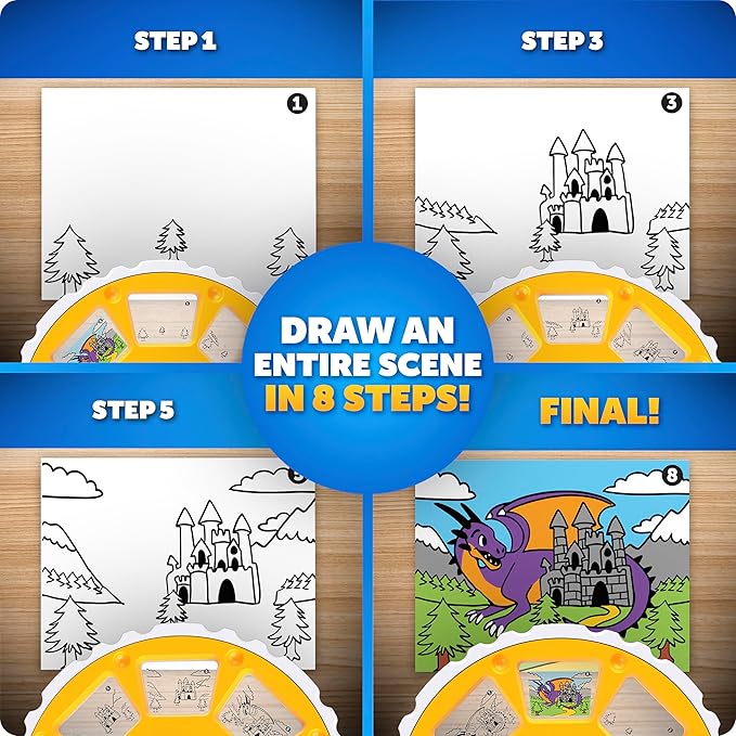 This incredible. patent-pending projector makes drawing fun and easy. with a special height-adjustable light source that reduces the occurrence of shadows while sketching. The kit comes with 4 swappable image discs. allowing kids to draw 25 animals. dinosaurs. and fantasy creatures. The fourth disc is a step-by-step drawing tutorial that gives kids the chance to create an entire scene on their own paper! They can follow the color suggestions from the discs. or customize with their own colors and art supplies!