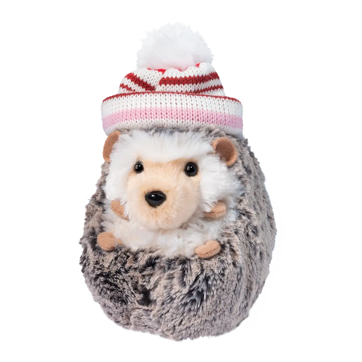 On his head sits a white. red. and pink striped hat with a fluffy pompom. This hedgehog plush radiates warmth and cuteness. making him a delightful addition to a stocking or perched in your Christmas tree. This little guy's tiny ears. hands and feet are too cute to handle. and his fur is so soft it's like holding a cloud.