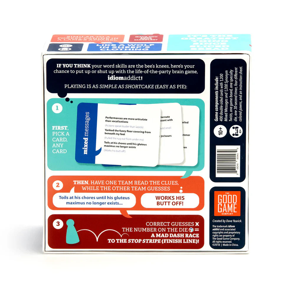 Idiom Addict™ is the party game that challenges players to decipher idioms and