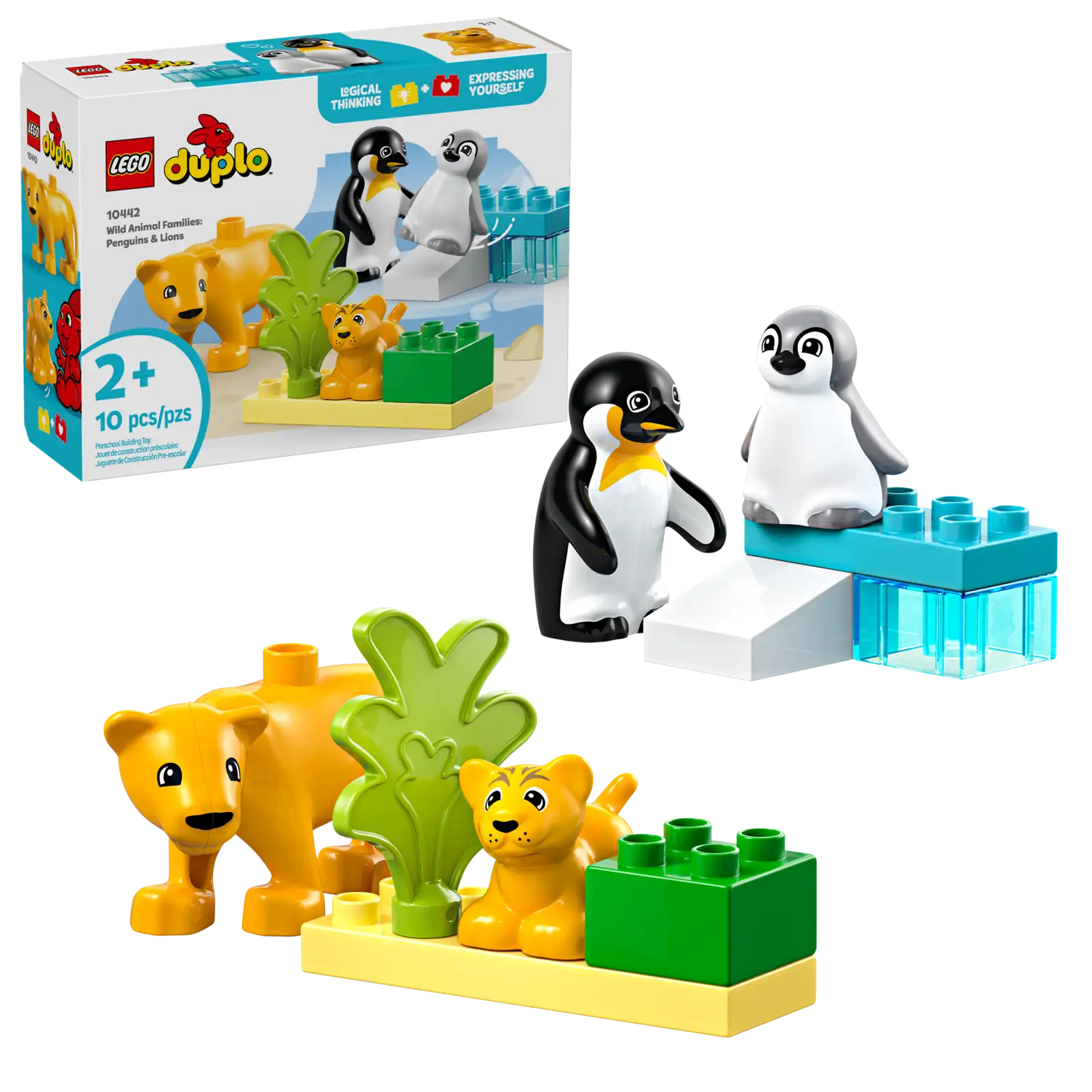 - Penguin and lion toys for kids – This role-play toy comes with 2 brick-built habitats and 4 LEGO® DUPLO® animal figures: a parentpenguin and chick and a lioness and her cub