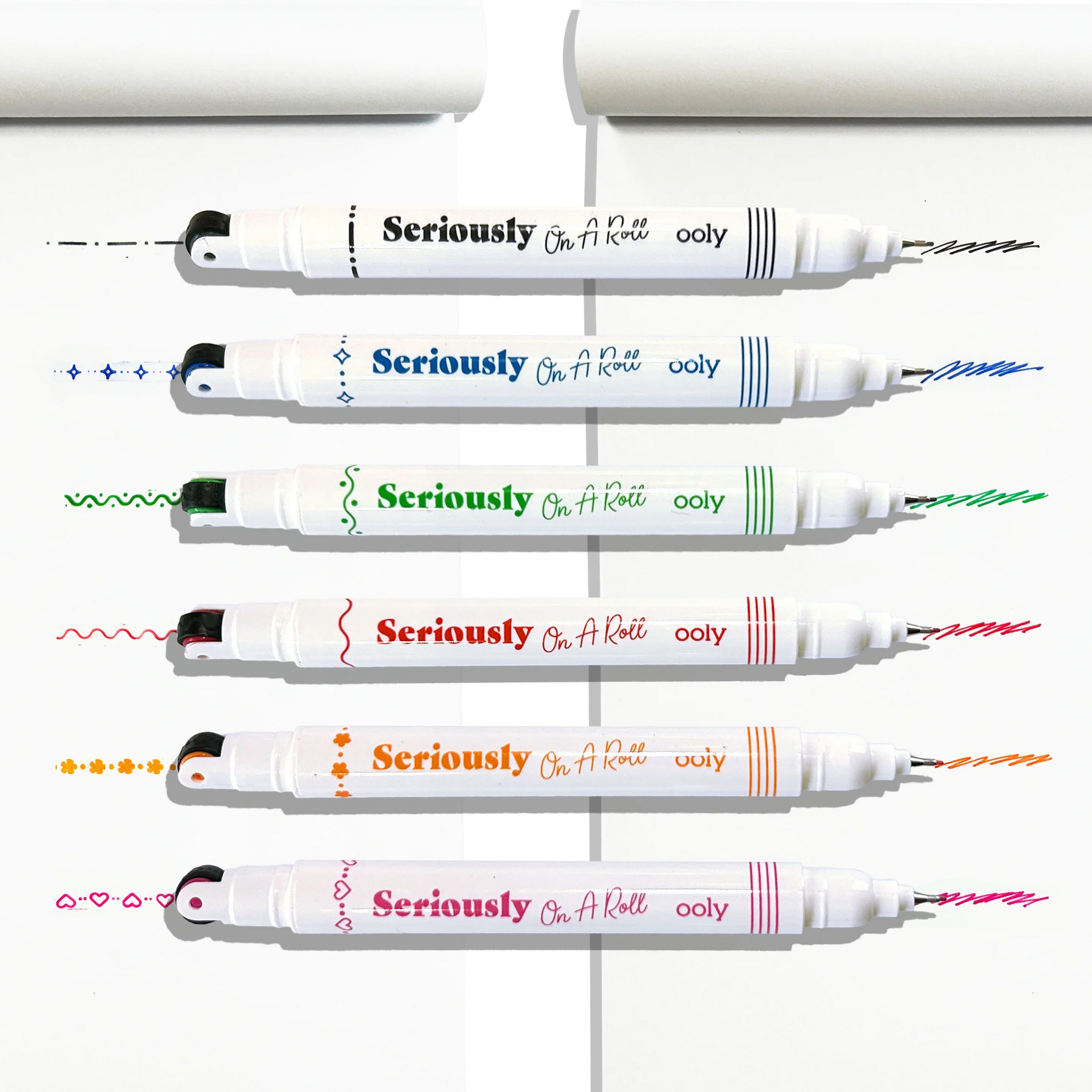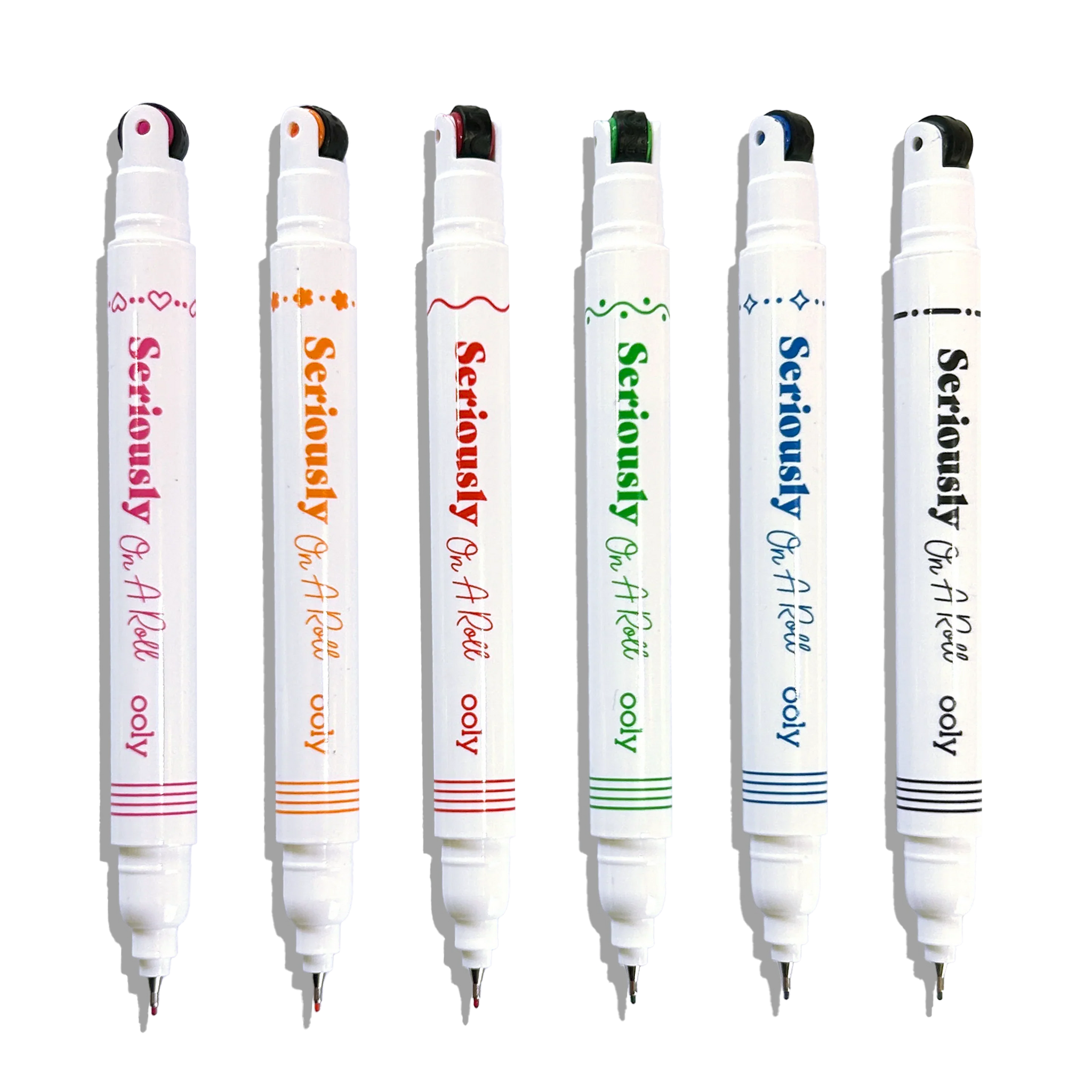 Get creative with every stroke using the Seriously On A Roll Roller Stamp & Fine Tip Markers! This set of 6 stamp markers combines roller stamper markers with fine tip markers. giving you the best of both worlds. Use the roller stamper end to add fun patterns and designs. then switch to the fine point felt tip for detailed writing. doodling. and planning.